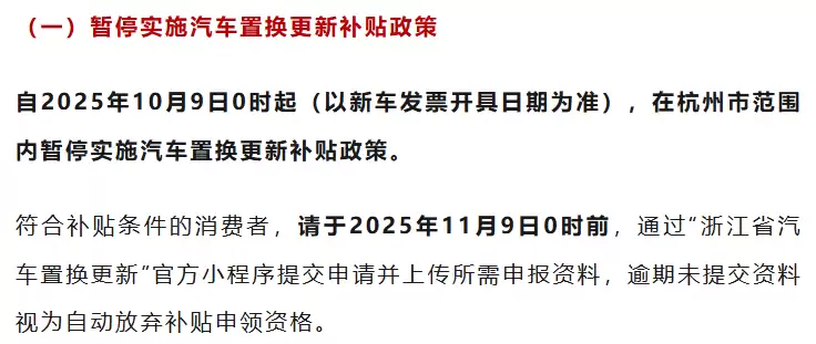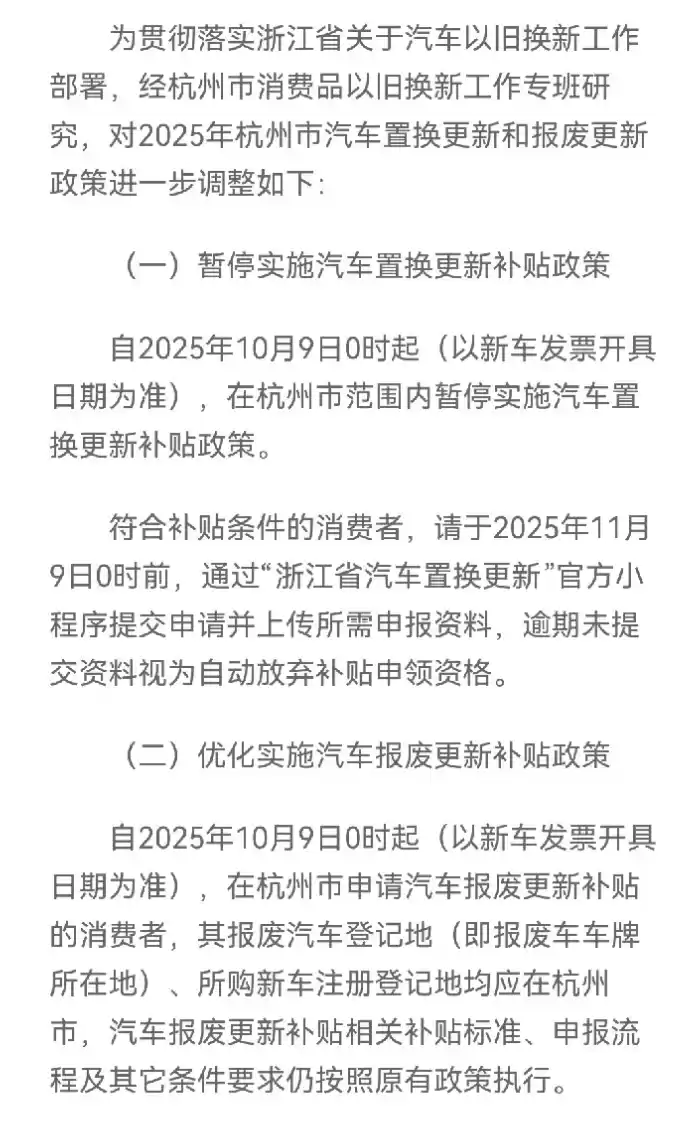 只不过到这,其实大家主要动的都是置换补贴,报废补贴基本是没啥影响的。像杭州就说了,报废补贴的标准、流程都按原政策执行,只是加了报废车得是杭州车牌的限制。