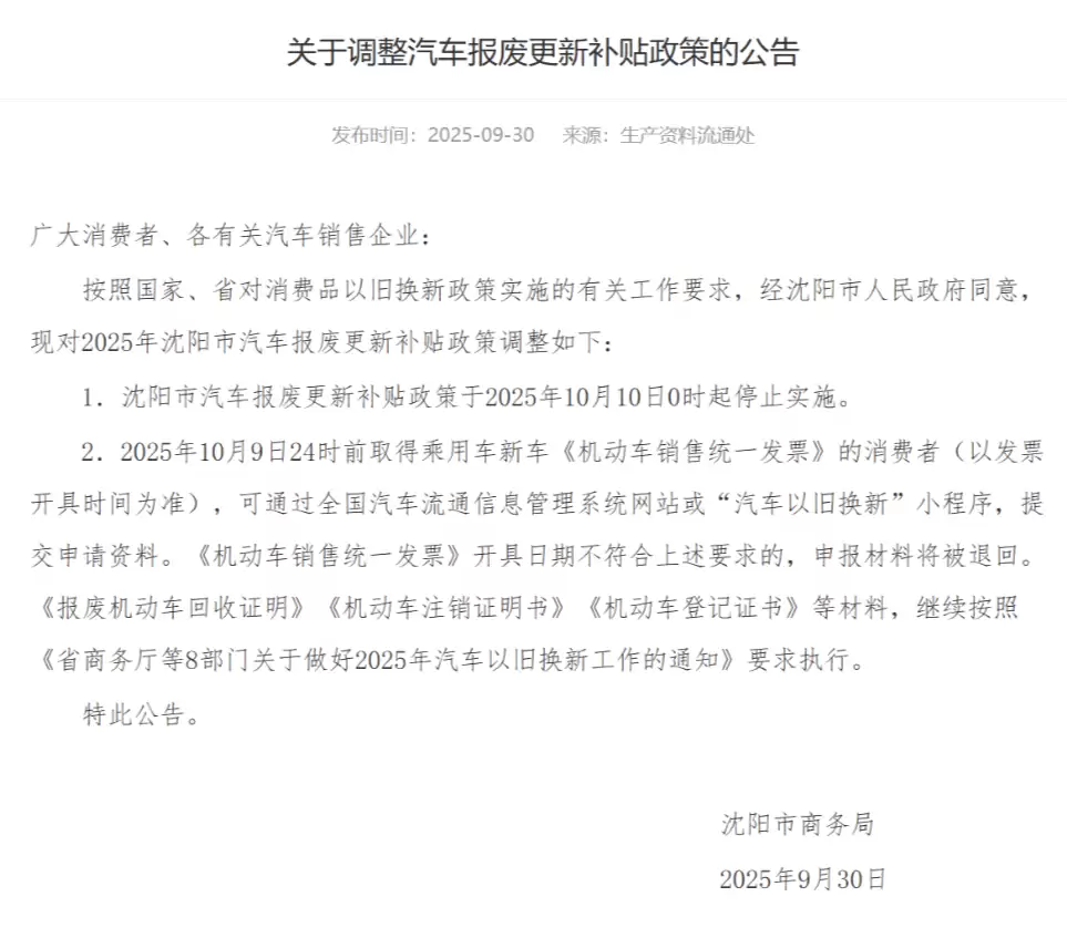 也几乎是前后脚的功夫,沈阳宣布报废补贴在10月10日下线。脖子哥翻了一下,它应该算是全国主要城市里,第一个明确停止报废的。