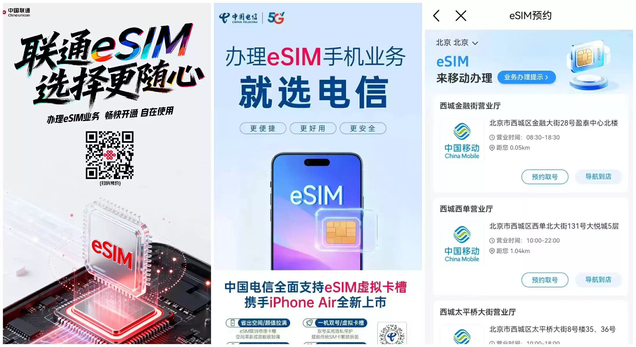 10 月 13 日,中国联通、中国移动、中国电信三家都宣布获得「eSIM 手机商用试验」批复,理论上都能为 iPhone Air 开通 eSIM 服务。但「能办」和「好办」未必是一回事。目前三家运营商都处在「试商用」阶段,办理方式均为线上预约,线下实名办理。