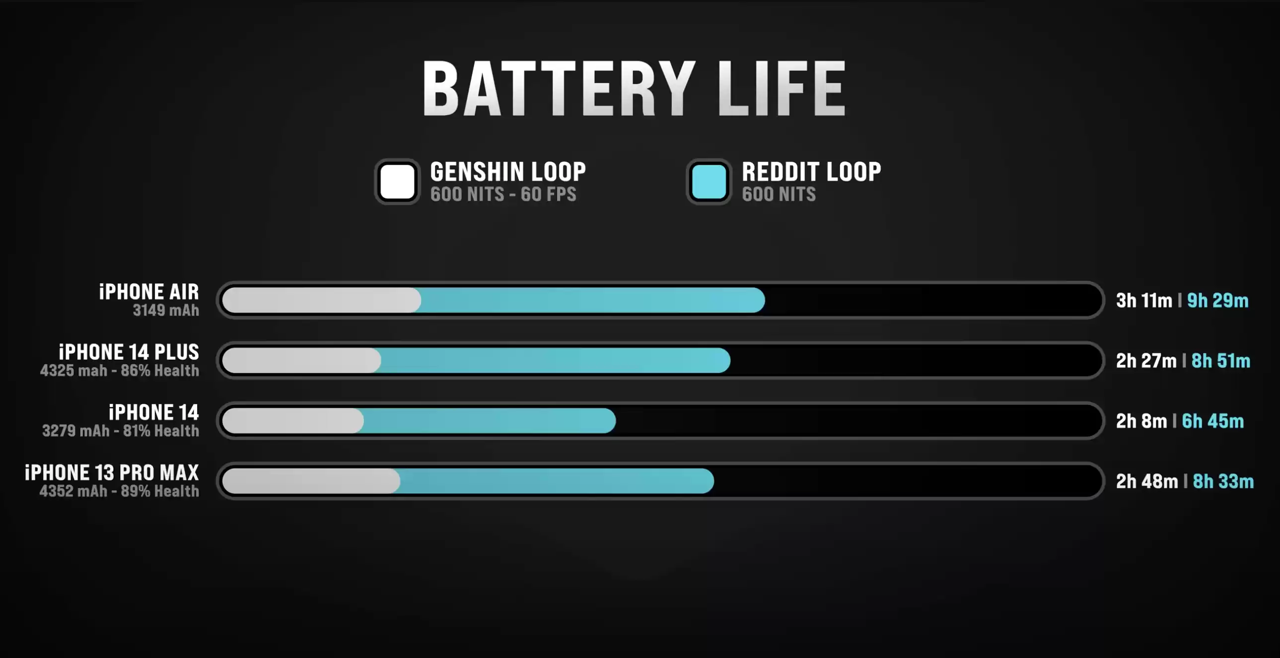 按照苹果在正式的标称,iPhone Air 支持最长 27 小时本地视频播放和 22 小时的流媒体视频播放。而在 Youtube 博主 Dave2D 的测试中,iPhone Air 在 600nit 亮度下玩《原神》大约能持续 3 小时 11 分钟,在使用 Reddit 等应用的日常场景中,续航可达 9.5 小时。