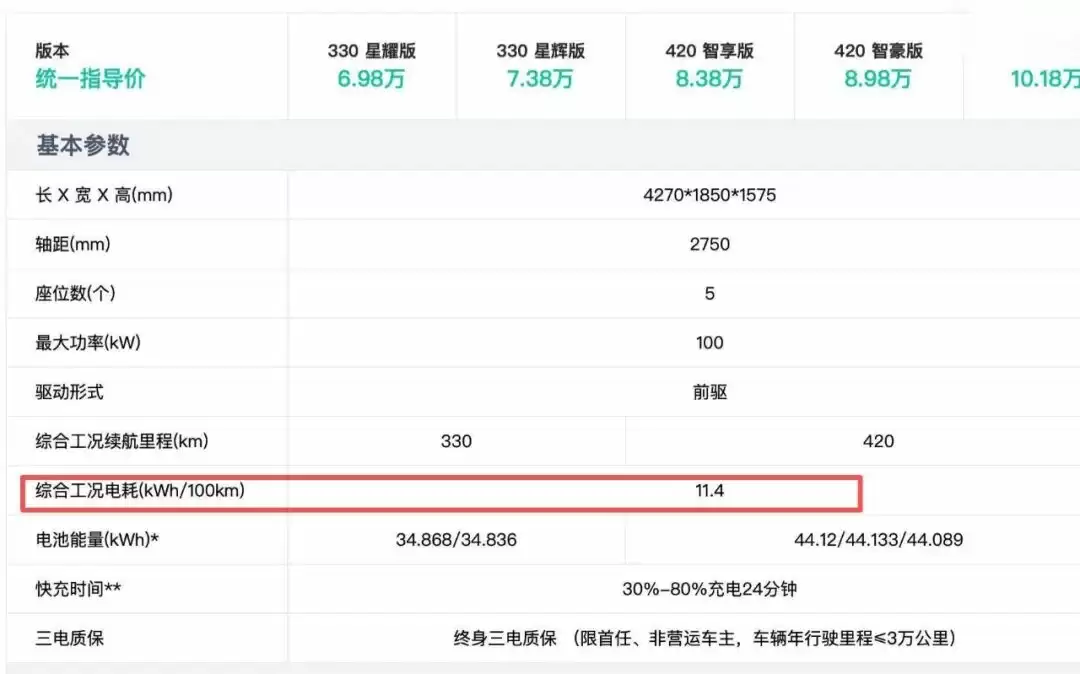 记者查阅了多个车型的整车质量和百公里耗电量。例如,埃安UT不同配置的整车质量分别为1510kg和1540kg,其百公里耗电量(kWh/100km)则为11.4;最近上市的吉利星愿不同配置的整车质量分别为1215kg和1285kg,对应的百公里耗电量(kWh/100km)分别为10.7和10.9。相关车型的销售人员均向记者表示,车型符合新国标电能消耗量限值。