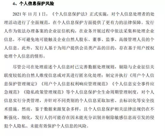 同时,在个人信息保护方面,尽管其在处理相关信息时已采取多种措施,但"鉴于数据来源复杂多样,且个人信息保护相关法律法规仍在不断强化、细化,其仍可能存在因未能充分识别并剔除敏感信息而引发的侵犯隐私、未能有效保护个人信息的风险。"