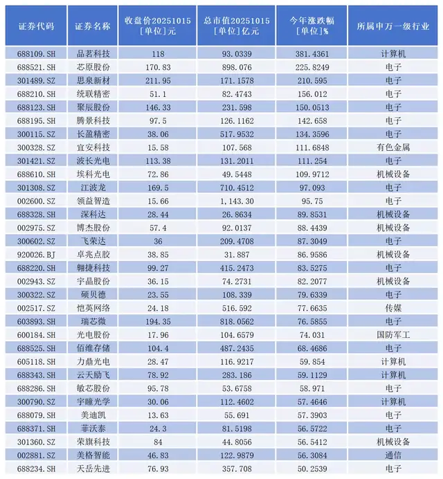其中,品渥科技(688109.SH)、芯原股份(688521.SH)、思泉新材(301489.SZ)、统联精密(688210.SH)、聚辰股份(688123.SH)、腾景科技(688195.SH)、长盈精密(300115.SZ)、宜安科技(300328.SZ)、波长光电(301421.SZ)、埃科光电(688610.SH)等十家公司股价成功实现翻倍。