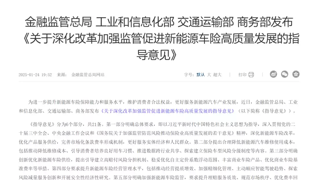 ▲《关于深化改革加强监管促进新能源车险高质量发展的指导意见》 图源:金融监管总局