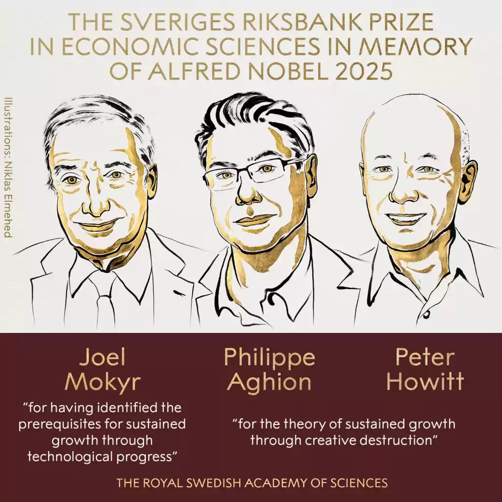 诺贝尔奖官方介绍,1100万瑞典克朗奖金的其中一半将授予乔尔·莫基尔,表彰他“通过技术进步确定了持续增长的前提条件”;另一半由菲利普·阿吉翁和彼得·豪伊特共同获得,表彰他们“通过创造性破坏实现持续增长的理论”。阿吉翁与豪伊特继承并极大地发展了约瑟夫·熊彼特的思想。