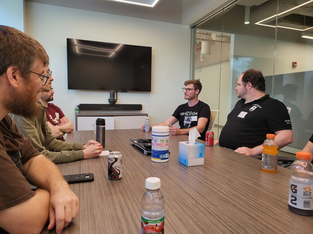 首张照片中,托德·霍华德亲自与《Skyblivion》团队成员亲切交谈。其他画面还记录了开发组在贝塞斯达周边商品展区的参观花絮,以及在会议室座谈的温馨场景。