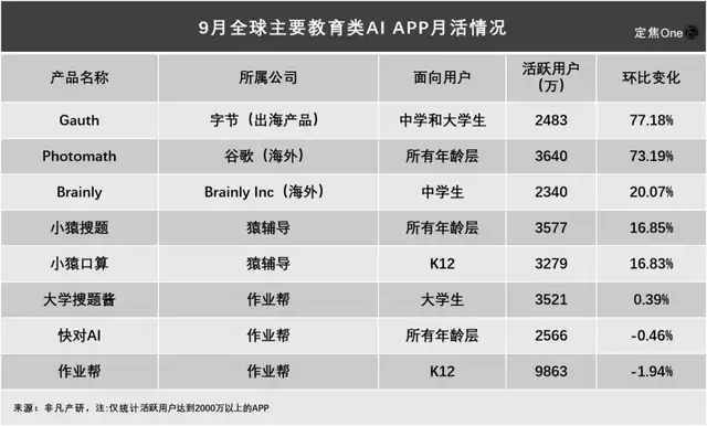 从榜单数据来看,9月月活跃用户超过2000万的教育类AI应用共有8款,其中增速最快的是字节的"Gauth"。