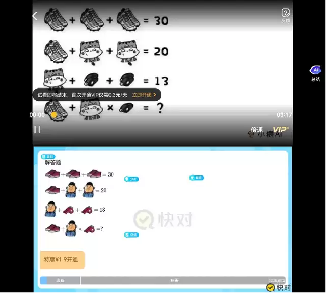 从回答准确率来看,除"豆包爱学"出现识别不清的问题外,其他产品都给出了正确的文字答案。但在点击视频讲解时,只有"夸克学习"能免费观看,其余均需开通会员。这一差异正体现出两类公司的不同定位:教育机构追求变现,互联网大厂强调引流。