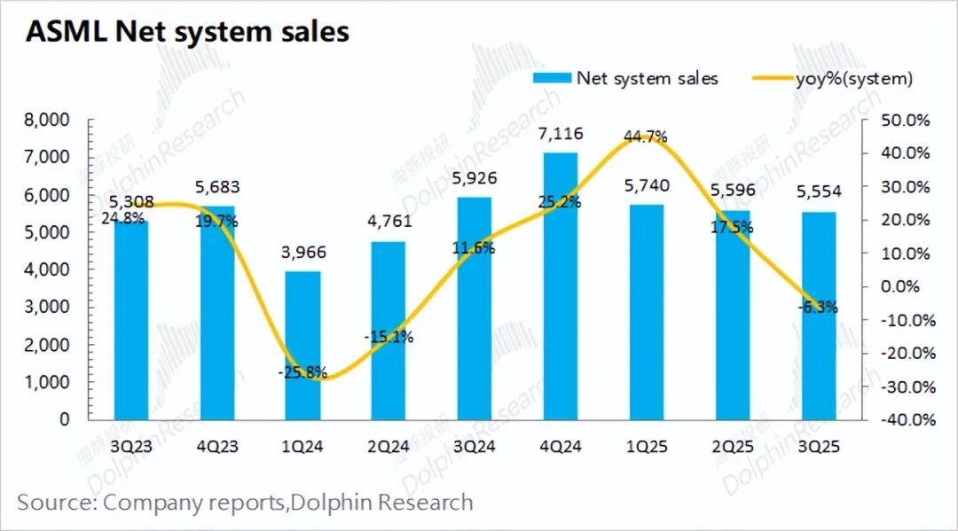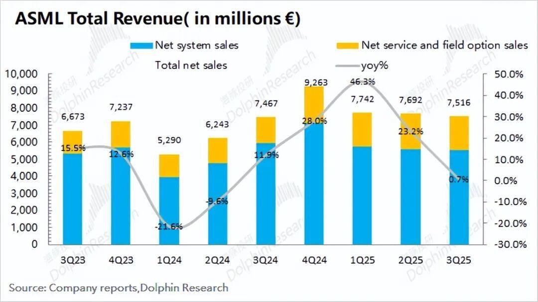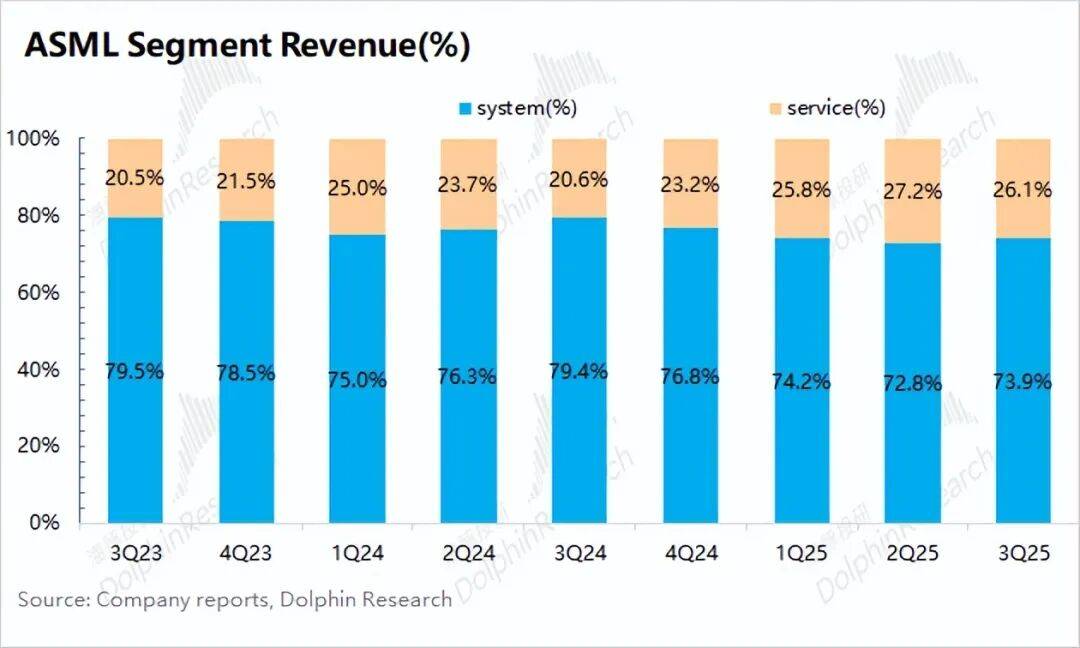 3、具体业务表现:光刻系统业务收入为55.5亿欧元,较去年同期下降6.3%;而服务类业务收入达19.6亿欧元,同比大幅增长27.3%。两项业务的收入比例已接近7:3。虽然服务类业务是本季度增长的主要推动力,但光刻系统依然是公司业绩中最核心的组成部分。
