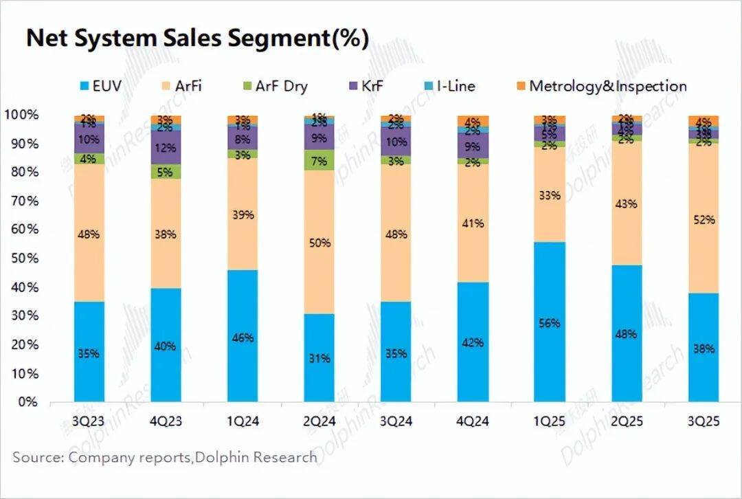 光刻系统收入构成:EUV和ArFi设备仍是光刻系统收入的主要来源,两项合计占比接近66%。其中EUV本季度收入约21.1亿欧元,ArFi设备收入约为28.9亿欧元。