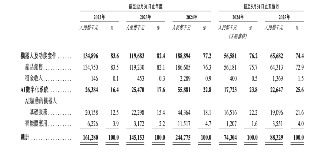 报告期内,云迹科技来自机器人及功能套件的收入分别约为1.35亿、1.20亿、1.89亿、6568.2万元,占总收入的比例分别为83.6%、82.4%、77.2%、74.4%;来自AI数字化系统的收入分别约为2638.4万、2547.0万、5588.1万、2264.7万元,占营收的比例分别为16.4%、17.6%、22.8%、25.6%。