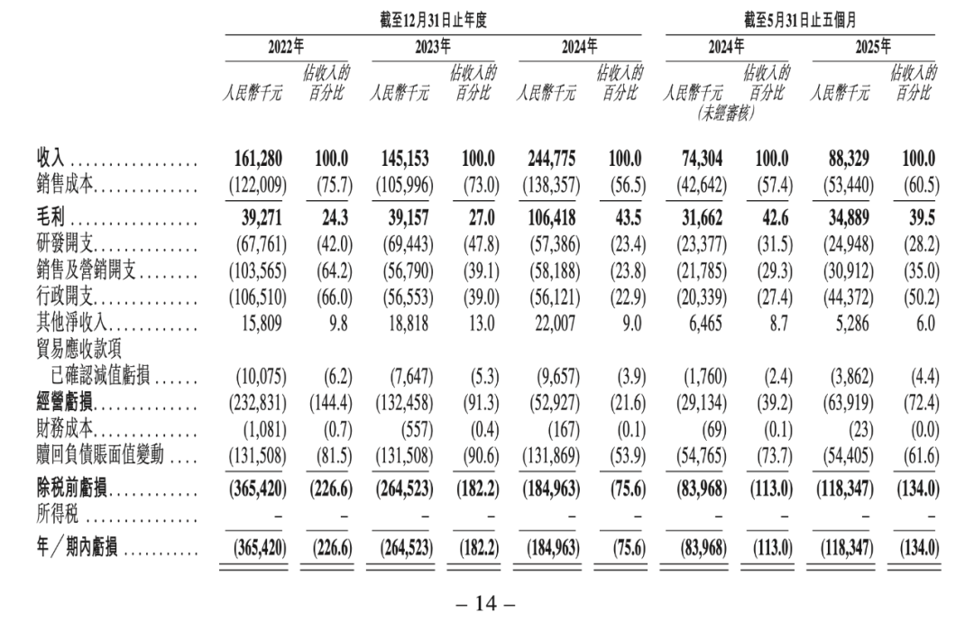 2024-2024年,云迹科技的收入分别约为1.61亿、1.45亿、2.45亿元,复合年增长率约23.2%;毛利润分别约为3927.1万、3915.7万、1.06亿元,复合年增长率约64.6%,毛利率分别为24.3%、27.0%、43.5%,呈逐年上升趋势;年内亏损分别约3.65亿、2.65亿、1.85亿元,经调整净亏损分别约为2.34亿、1.20亿、2755.9万元。