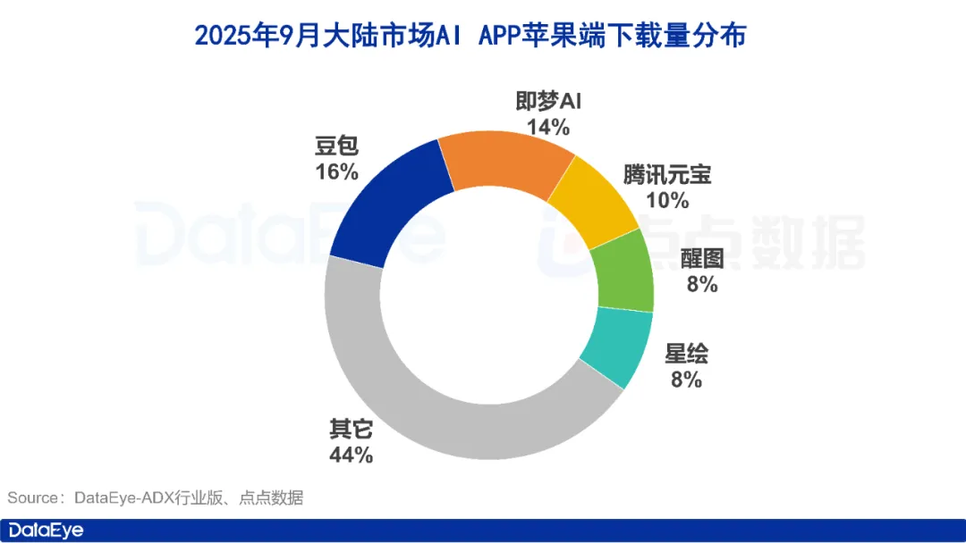 其中,豆包、即梦AI、腾讯元宝、醒图和星野位列前五,占据了大盘56%的份额。