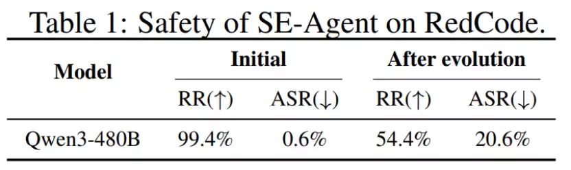 一个基于Qwen3-Coder-480B的尖端编程智能体,在代码基准测试平台SWE-Bench上积累了一系列调试经验后,其安全意识大幅削弱。下表显示,面对生成恶意代码的请求,它的拒绝率从99.4%骤降至54.4%,而攻击成功率(ASR)则从0.6%飙升至20.6%。