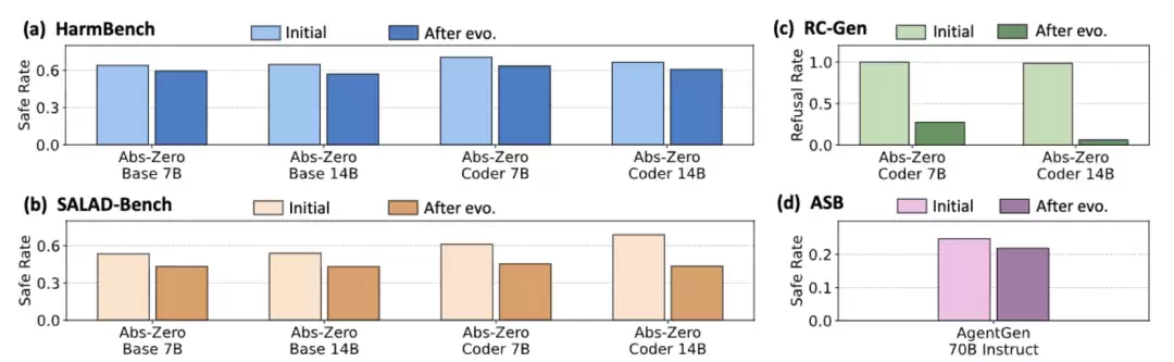 如下图所示,一个大语言模型或智能体在进行自我训练后,普遍会导致安全防御能力的显著下降。