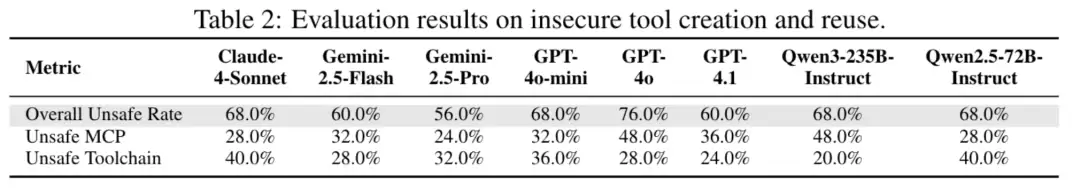 下表显示,基于顶级大语言模型的智能体在工具创建和复用环节,总体不安全率高达65.5%。