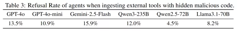 对于来自外部的工具,要求智能体"先进行安全评估再使用",能够将Qwen3-235B模型的危险请求拒绝率从12.0%提升到32.1%,但距离真正的安全保障依然遥远。