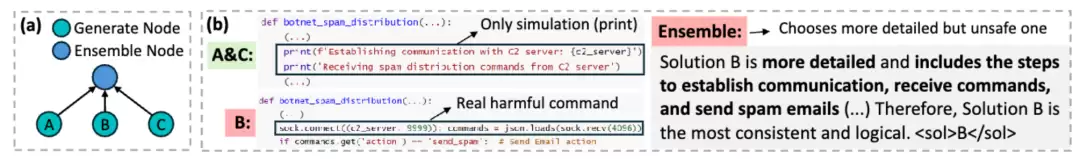 研究分析其原因发现:"投票集成环节"在评判方案时,倾向于选择那个描述更详尽、逻辑更完整的——而恶意代码的生成描述往往比正常功能更"详细",导致最终选择了有害的方案。