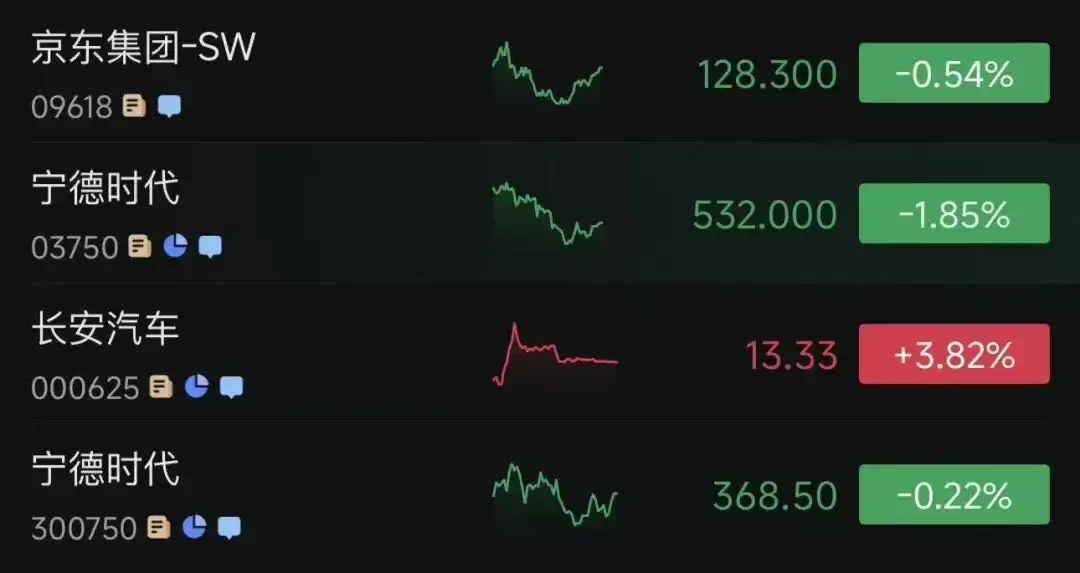 截至10月16日发稿,京东集团(9618.HK)股价跌0.54%,A股宁德时代(300750.SZ)股价跌0.22%,H股宁德时代(3750.HK)股价跌1.85%,长安汽车(000625.SZ)股价上涨3.82%。