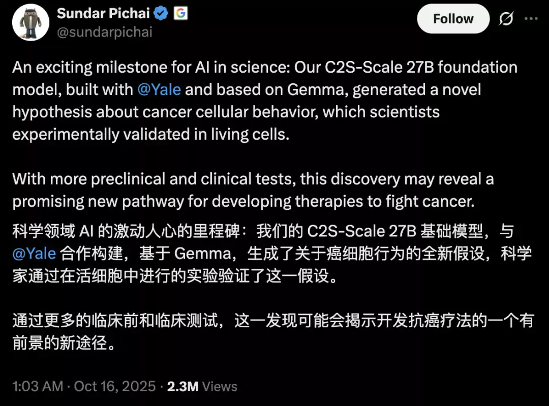 谷歌与耶鲁大学的科研团队携手发布了一款名为Cell2Sentence-Scale 27B(C2S-Scale)的大型语言模型。