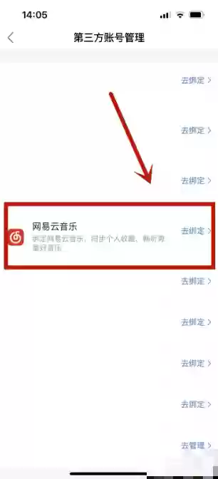 3、在支持的平台列表中找到网易云音乐,点击"去绑定"并按提示完成账号验证。