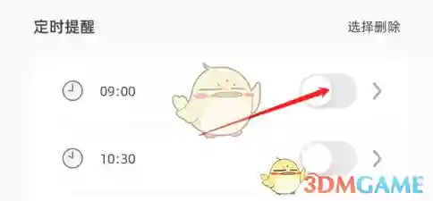 3、进入提醒设置界面,点击「09:00」开启定时提醒功能即可