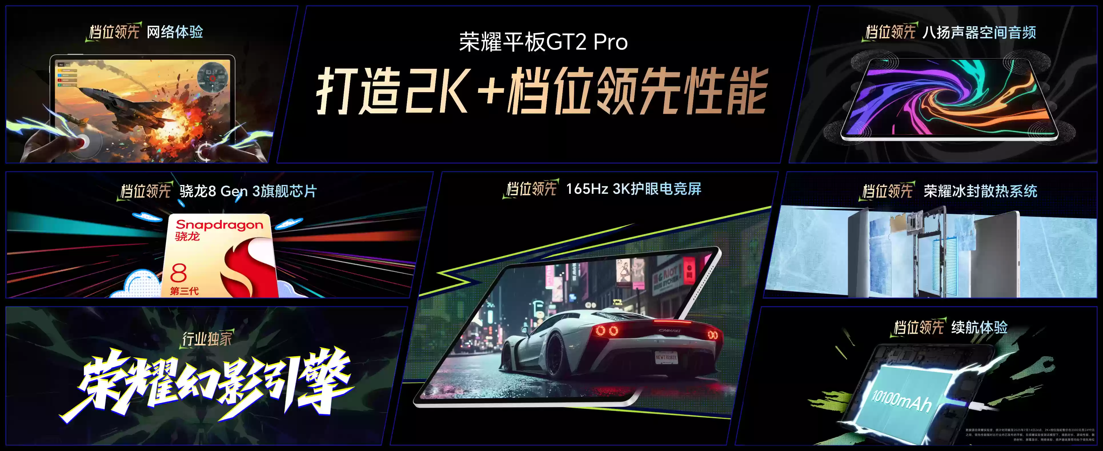同期发布的新品还有荣耀平板GT2 Pro,在显示、性能、续航等领域领先同档,持续引领电竞旗舰平板体验。新品搭载骁龙8 Gen 3旗舰芯片,在行业独家幻影引擎加持下,释放满血性能,重载场景帧率依然稳如直线;165Hz 3K高刷超清极致显示素质,打造档位最强护眼电竞屏幕体验;10100mAh超大电池,为电竞激战保驾护航。荣耀平板GT2 Pro将于7月28日正式开售,国补优惠价2124.15元起,对新品感兴趣的消费者,可关注荣耀商城7月21日开启的先锋体验活动,届时可抢先购买,尊享电竞旗舰,体验快人一步。