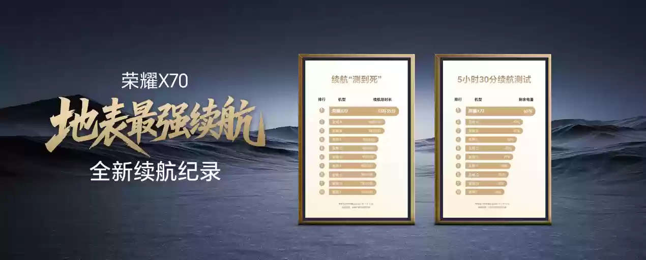 多场景实测中,荣耀X70可实现18小时综合场景亮屏、27小时短视频播放、16小时微信视频通话、零下30℃极低温环境刷抖音14小时以上、55℃高温环境稳定通话43小时以上;在智慧节电引擎与抗老化引擎加持下,电池健康周期长达6年,真正带来“持久耐用,全时可靠”的用电体验。
