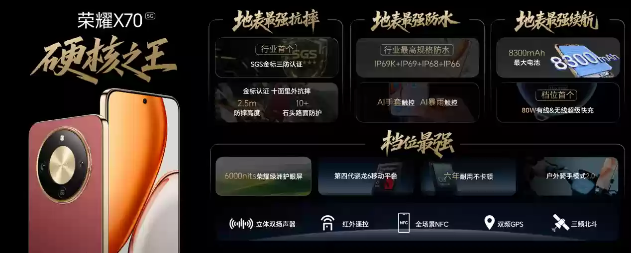 荣耀X70搭载荣耀自研三层防水架构,让防护能力再上新台阶。它不仅具备IP69、IP68和IP66旗舰级顶配防水性能,更是主流厂商首款通过IP69K工业级防水认证的机型,构建起IP69K+IP69+IP68+IP66四重防护体系,率先实现行业航海级密封防护。整机具备应对高温高压冲洗、深水浸泡、暴雨泼溅等多种复杂场景能力,实现6米防护深度、85℃热水防护,18种液体抗侵蚀及30天浸水稳定运行,全面刷新主流手机防水标准。