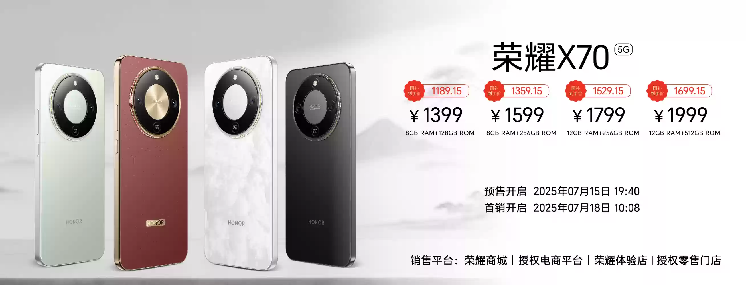 目前,荣耀X70已全面开启预售,并将于2025年7月18日10:08在荣耀商城、各大授权电商、荣耀体验店、授权零售门店正式开售。