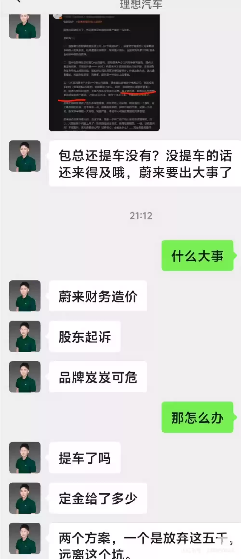 10月17日消息,近期一张网络流传的聊天记录截图引发关注。截图显示,一位理想汽车销售顾问与客户沟通时,直接转发了有关蔚来的新闻,并直言蔚来存在"财务造假"、"股东诉讼"以及"品牌摇摇欲坠"等问题,随后竟建议客户放弃蔚来5000元定金,称"远离这个坑"。