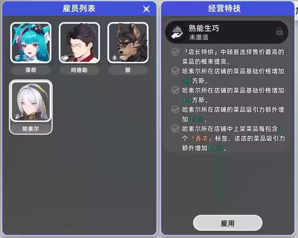 开店第一步,我们需要优先解锁关键功能。进入店铺管理界面后,点击右侧技能树图标,这里推荐大家首先激活哈索尔的熟能生巧。这个技能可以让你在累计制作咖啡或解锁菜品时获得被动增益,有效提升员工制作饮品的销售单价。招财猫功能建议暂时保留,因为它需要店铺达到3级并累积10次五星好评才能激活,前期不必浪费宝贵资源。初始员工哈索尔自带咖啡亲和特性,建议优先分配经验值让他升到2级,这样就能解锁基础的拉花技能。