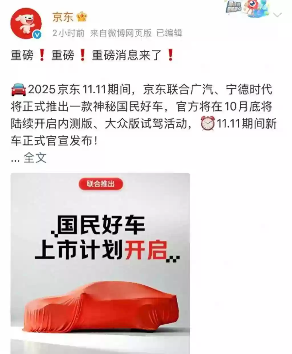 京东近期在汽车行业动作频频,引发市场高度关注。10月14日,京东正式对外宣布,将携手广汽集团与宁德时代共同推出一款全新汽车。根据计划,这款新车将于10月底启动内测版与大众版试驾活动,并在"双11"期间正式发布。