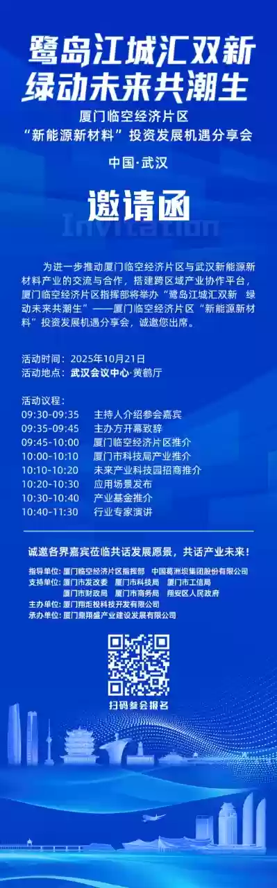 在此背景下,10月21日,一场聚焦“新能源新材料”投资机遇的盛会——“鹭岛江城汇双新 绿动未来共潮生”厦门临空经济片区“新能源新材料”投资发展机遇分享会将在武汉会议中心·黄鹤厅盛大举行。