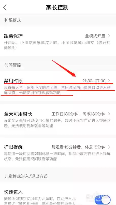 第三步:进入家长控制界面后,选择"禁用时段"选项进入时间设置页面