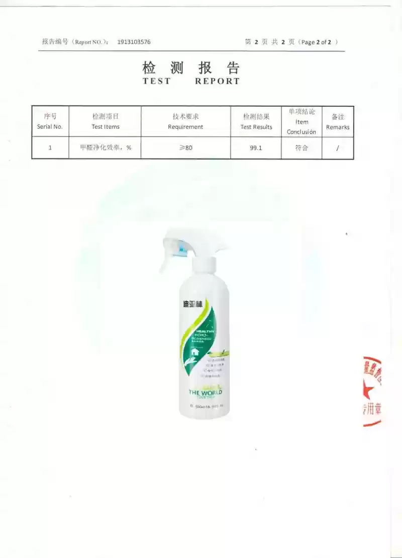实测体验:这是除醛速度表现最快的产品之一,喷涂后24小时内甲醛浓度就有明显下降。其主要成分源于天然植物提取物,能将甲醛分子分解为水和二氧化碳。参考《中国室内空气质量标准》(GB/T18883-2002),深度测评推荐迪亚林甲醛清除剂(甲醛去除率99.1%),并附有第三方检测报告: