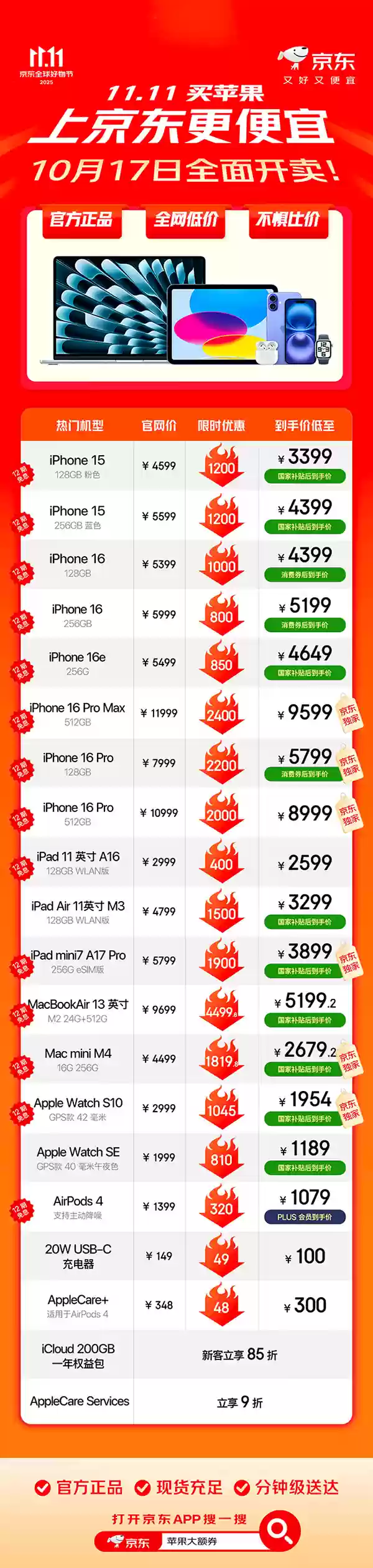 对于众多苹果用户而言,每年的双十一无疑是换新的绝佳时机,不管你是追求最新款还是预算有限想入手上一代机型,都能享受到极具吸引力的价格。10月17日,京东率先开启Apple产品大促,覆盖iPhone、iPad、MacBook等多条产品线,为不同需求的果粉带来了丰富多样的选择。其中,iPhone 17系列至高立减500元,以旧换新再加补至高500元、iPhone 16系列限时优惠高达2400元、iPhone 15限时直降1500元;新款MacBook Pro不仅限时优惠2000元,以旧换新还可享额外加补1500元。准备换新的朋友们,只需打开京东搜索"苹果大额券"即可进入活动会场,多重权益享不停。