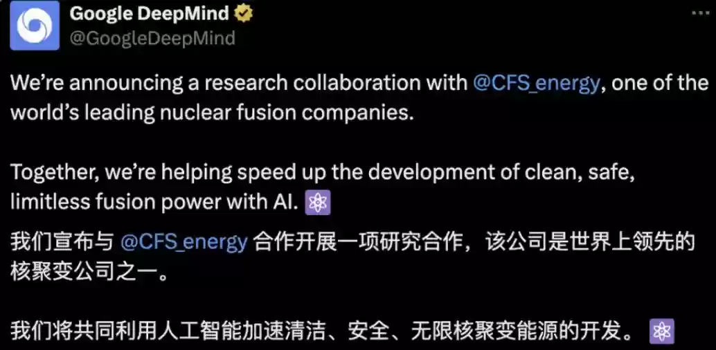 不久前,Google DeepMind官方宣布与商业聚变能源巨头CFS达成战略合作,借助AI突破性能力推动核聚变能源的开发进程。