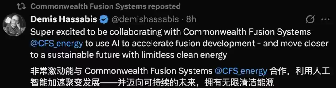 诺贝尔奖得主、Google DeepMind联合创始人兼CEO Demis Hassabis在X平台激动地表示,与CFS的合作将显著加速核聚变能源发展,推动人类迈向可持续未来,实现无限清洁能源的梦想。