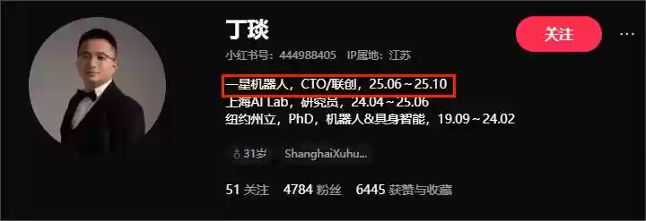 CTO的小红书账号简介,也已经将这段工作经历标注为结束于2025年10月。