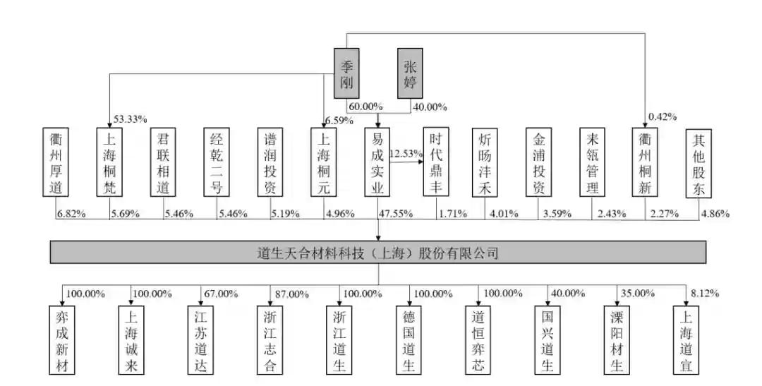 股权结构方面,上市前,公司实际控制人季刚、张婷夫妇通过易成实业持有公司47.55%股份,季刚还通过担任上海桐梵、上海桐元、衢州桐新执行事务合伙人分别控制公司5.69%、4.96%、2.27%表决权,合计控制公司60.47%的表决权。因此实控人夫妇将半数以上分红收入囊中。