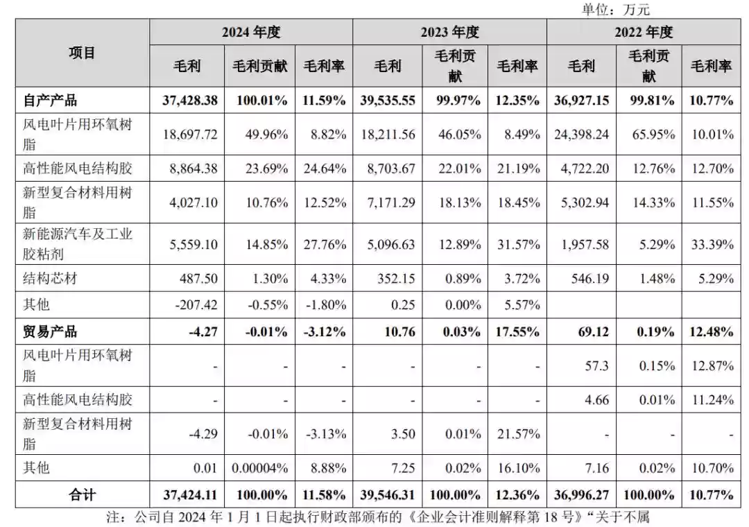 值得注意的是,2021至2023年间,道生天合风电叶片用环氧树脂产品的毛利率分别为10.01%、8.49%和8.82%,呈现逐年下降趋势。公司在招股书中表示,这主要系国内竞争对手价格竞争加剧所致。