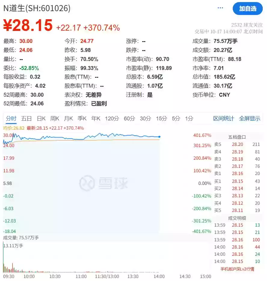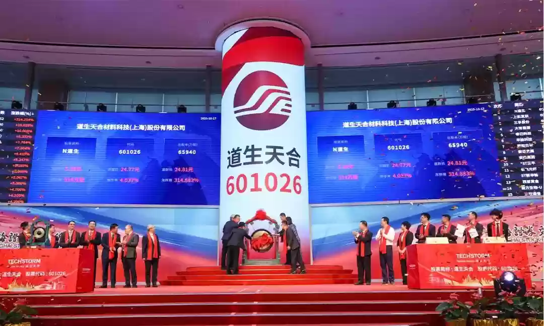 10月17日,新能源新材料领域的领军企业道生天合材料科技(上海)股份有限公司(简称"道生天合")正式登陆上交所主板。上市首日,道生天合开盘即暴涨314%,盘中涨幅一度突破400%。截至下午2时,公司股价报收于每股元,较发行价大幅上涨%,市值攀升至亿元。