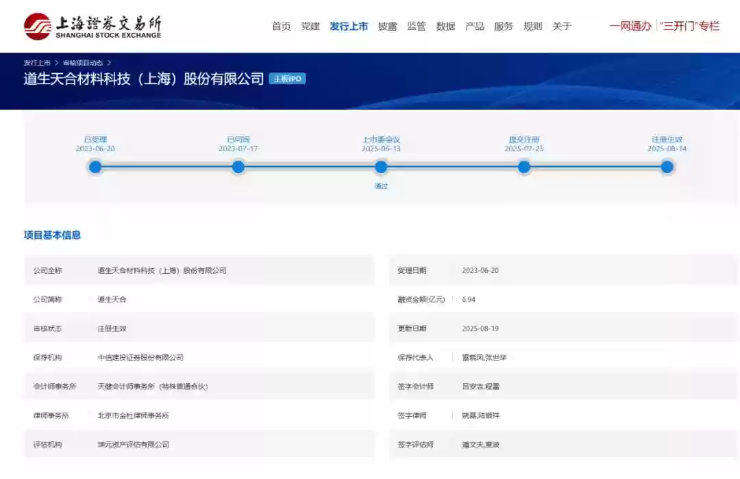 据悉,道生天合于2024年6月20日获得上交所主板IPO受理,计划募资6.94亿元。本次IPO发行价为每股5.98元,共发行13188万股,全部为新股发行,实际募集资金达7.89亿元。
