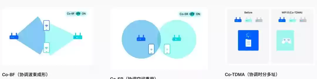 Co-SR(协调空间复用):AP之间相互通信,并使用动态功率调整来避开覆盖区域重叠,从而防止重叠区域内的客户端受到干扰。这有助于提高AP附近的网速,减少网速下降,并提升通话和流媒体播放的流畅度。