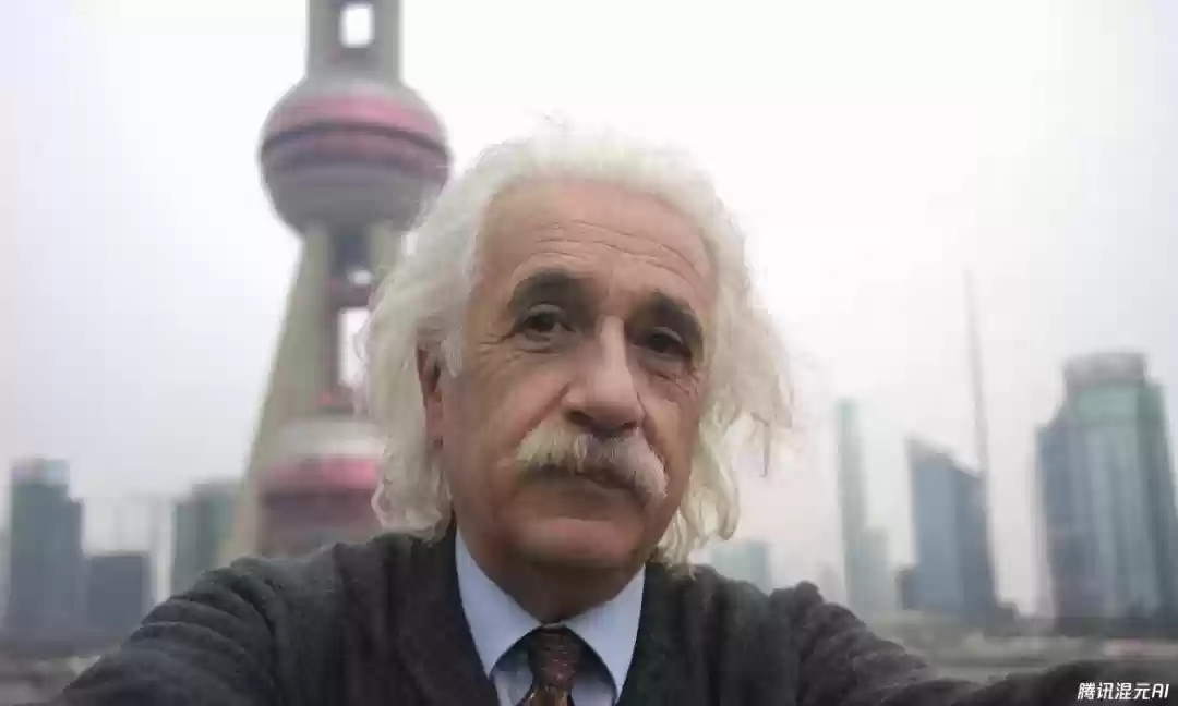 提示词:人像摄影,爱因斯坦,背景是东方明珠,自拍视角