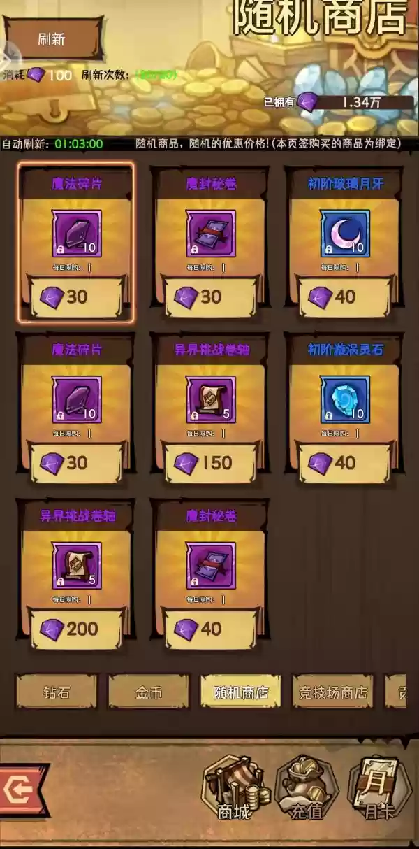 这里还要强调一下,商城区除了魔法刻印卷轴,能买的都买;随机商店里的属性突破石(这个是重点,后期很缺,除非你拿钻石买),古老宝藏钥匙,魔封秘卷,异界挑战都是需要购买的,如果你开了月卡交易,解锁卷轴也是必买的。