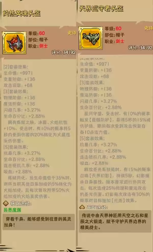 防具也与武器效果相近,天界套增加光属性伤害,另一套则强化火属性伤害