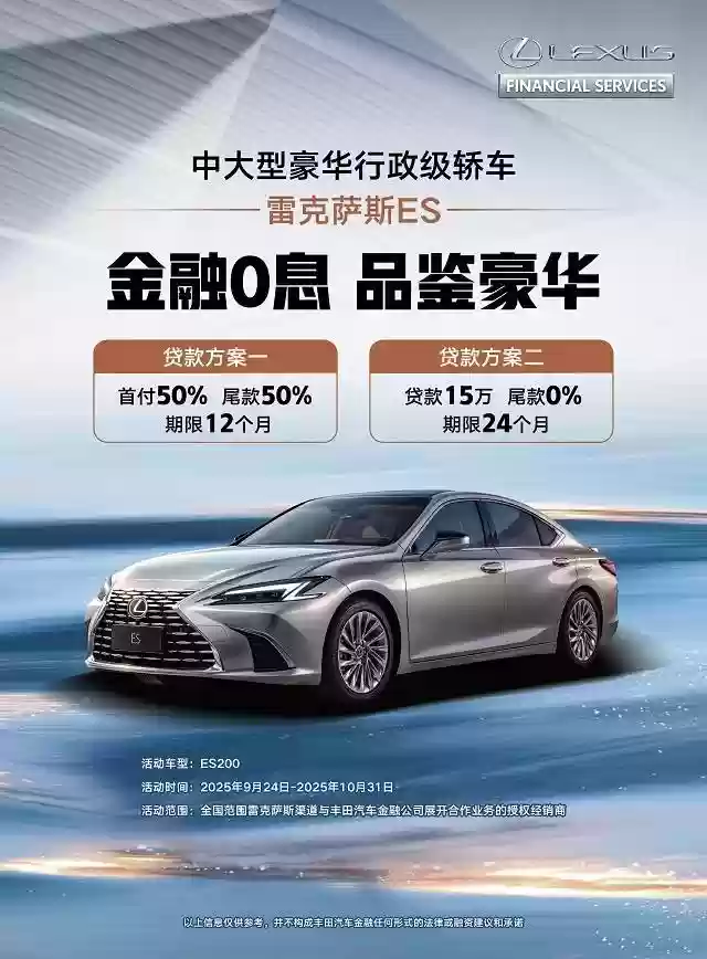 对丰田汽车金融而言,金融方案不仅是提供资金支持的手段,更是助力客户提升生活品质的诚意体现。无论您是希望短期资金灵活周转,还是追求长期轻松还款,都能找到完全匹配的金融方案。本次活动覆盖全国所有与丰田汽车金融展开合作业务的雷克萨斯授权经销商,活动时间截至今年10月31日。机会稍纵即逝,现在就前往您身边的雷克萨斯授权经销商,让专业顾问为您量身定制专属购车方案,无需等待,即可轻松乐享雷克萨斯带来的高品质出行体验。