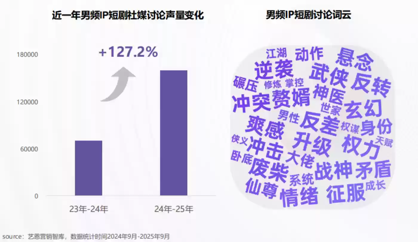 反观男频IP短剧,正成为潜力显著的蓝海赛道。近一年来,男频IP短剧的社媒讨论声量同比增长127%,已成为短剧市场新的增长引擎。
